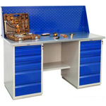 Верстак бестумбовый поставляется в разобранном виде (4 места). Нагрузка на столешницу до 600 кг. Стандартный цвет: корпус - серый глянец RAL 7030, ящики и двери тумб - синий RAL 5017. Размеры: 855х1000х420мм. Вес: 24 кг.