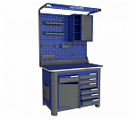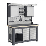 Нагрузка на столешницу 1500 кг. Столешница из листа влагостойкой фанеры марки ФСФ толщиной 40 мм и листом горячекатаной стали толщиной 5 мм. Рама верстака выполнена их холоднокатаной стали. Модуль верстака выполнен сварными. Ящики в модулях устанавливаются на шариковых телескопических направляющих полного выдвижения. Квадратная перфорация для установки крючков, держателей. Размеры: 1982x1493x743 мм.