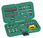 Набор 47 предметов включает: головки 1/4", головки с насадкой SL 1/4", головки с насадкой PH 1/4", головка с насадкой HEX 1/4", ключи шестигранные, трещотка 1/4", удлинители, вороток с плавающей головкой 1/4", карданный переходник 1/4", вороток 1/4".