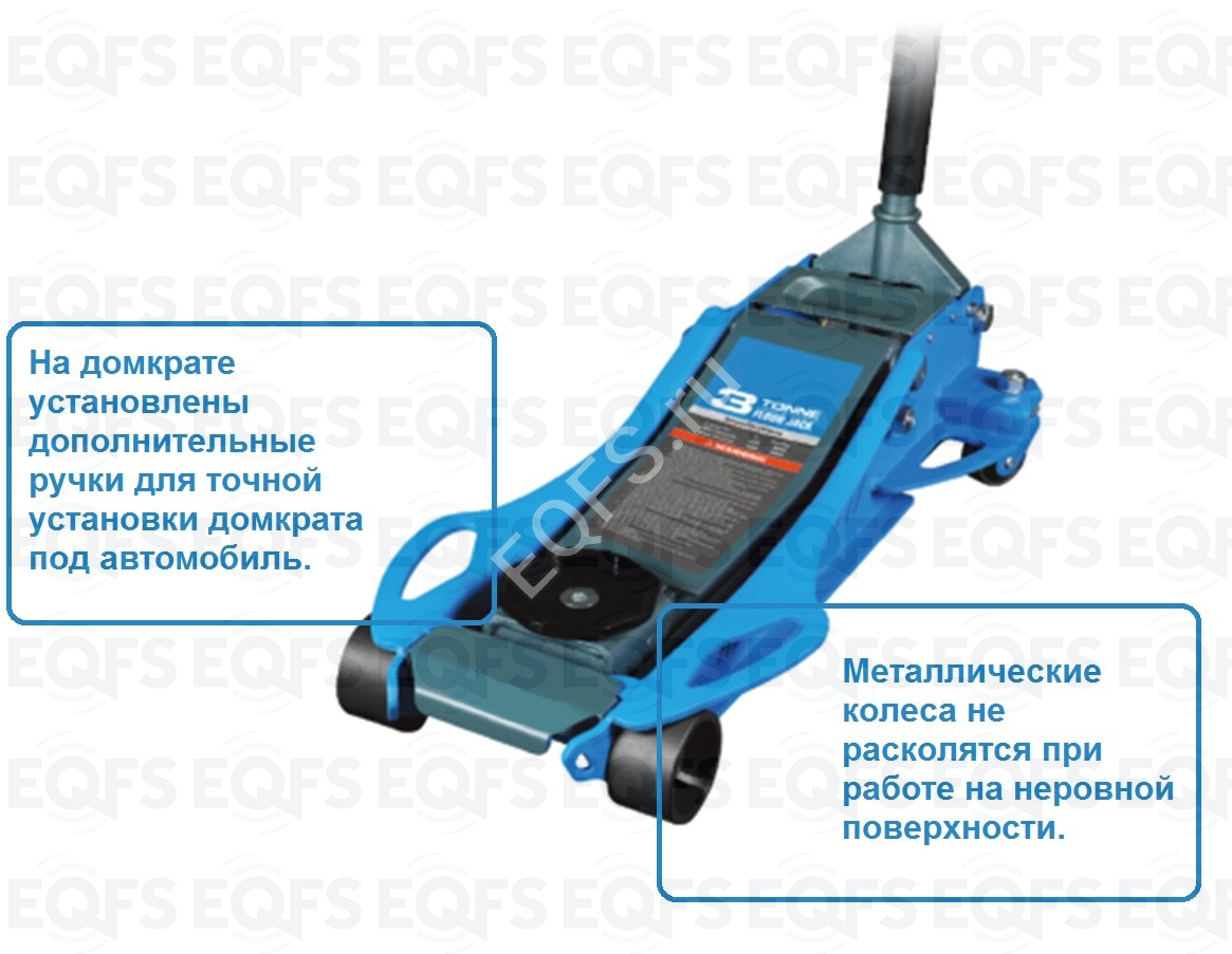 . Увеличенный диаметр металлических колес домкрата, позволяет легко транспортировать его по не ровным поверхностям.