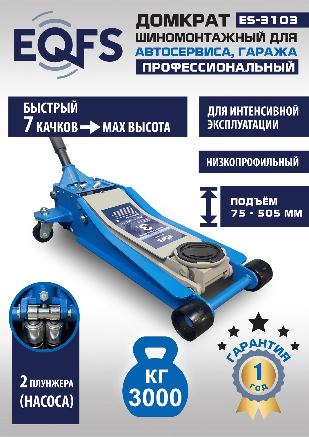ES-3103 Домкрат подкатной низкопрофильный 3т. (2 шт.) Гарантия 1 год. Профессиональный. Для интенсивной эксплуатации. 7 качков для поднятия на макс высоту. Подкатной. Низкопрофильный. Двухштоковый механизм. Усиленная конструкция. Быстрый подъем. Имеет повышенную износостойкость. Поворотная ручка, тавотница, лоток для хранения и резиновая накладка на чашку домкрата в комплекте. Грузоподъемность 3 тонны с усиленными ребрами жесткости. Высота подъема мин / макс - 75-505 мм. ВЕС - 34,5 кг.