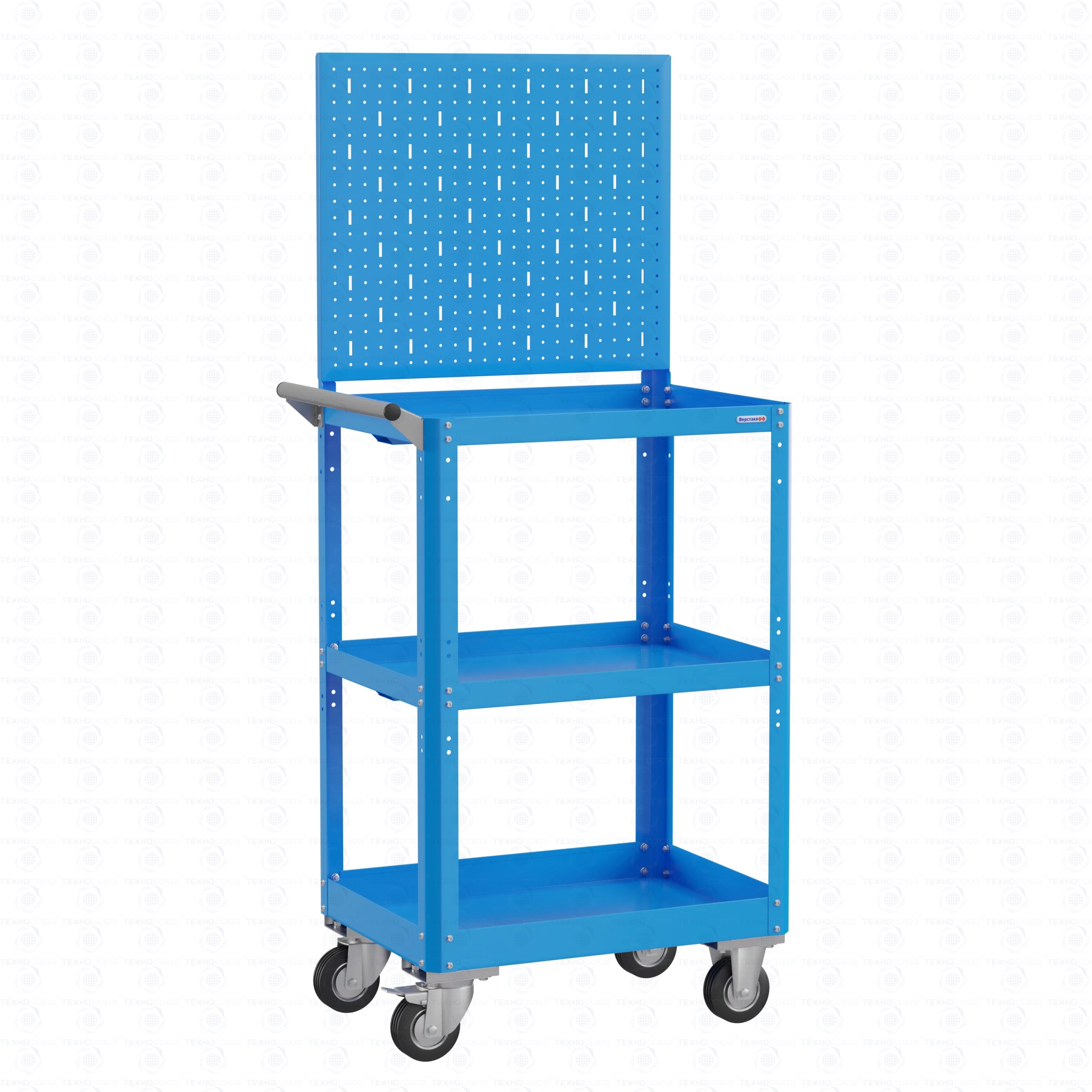 Корпус выполнен из листовой стали толщиной от 0,6 до 1,5 мм., покрыт полимерной порошковой краской. С перфорированной панелью для навесных элементов. Общая равномерно-распределённая нагрузка на тележку - до 100 кг. Верхняя и средняя полка имеют высоту борта 40 мм., нижняя полка имеет высоту борта 60 мм. Размер 950х600х450 мм.