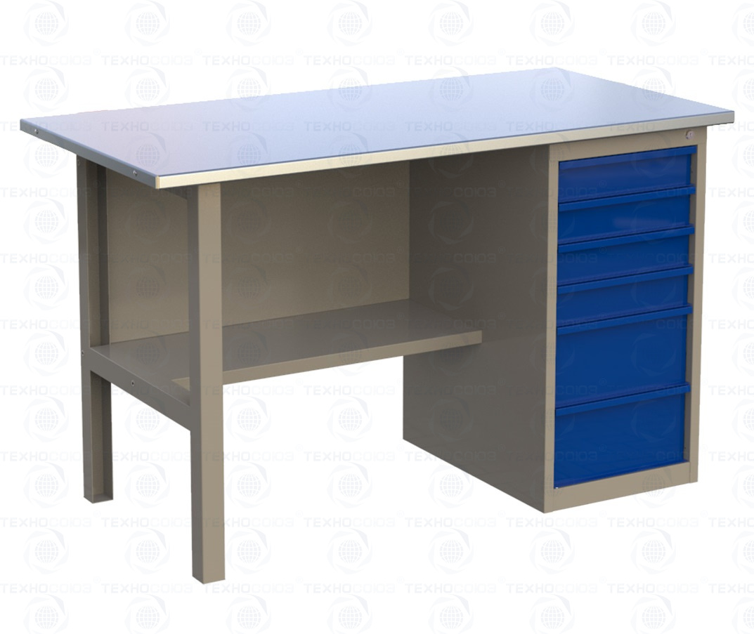 Верстак однотумбовый поставляется в разобранном виде. Нагрузка на столешницу до 600 кг. Стандартный цвет: корпус - серый глянец RAL 7030, ящики и двери тумб - синий RAL 5017. Размеры:855x1400x700 мм. Вес: 86 кг.